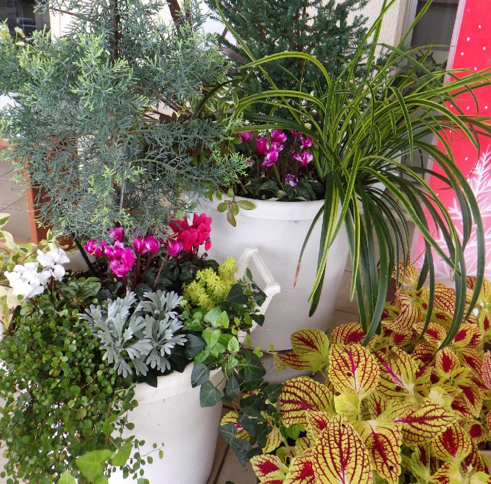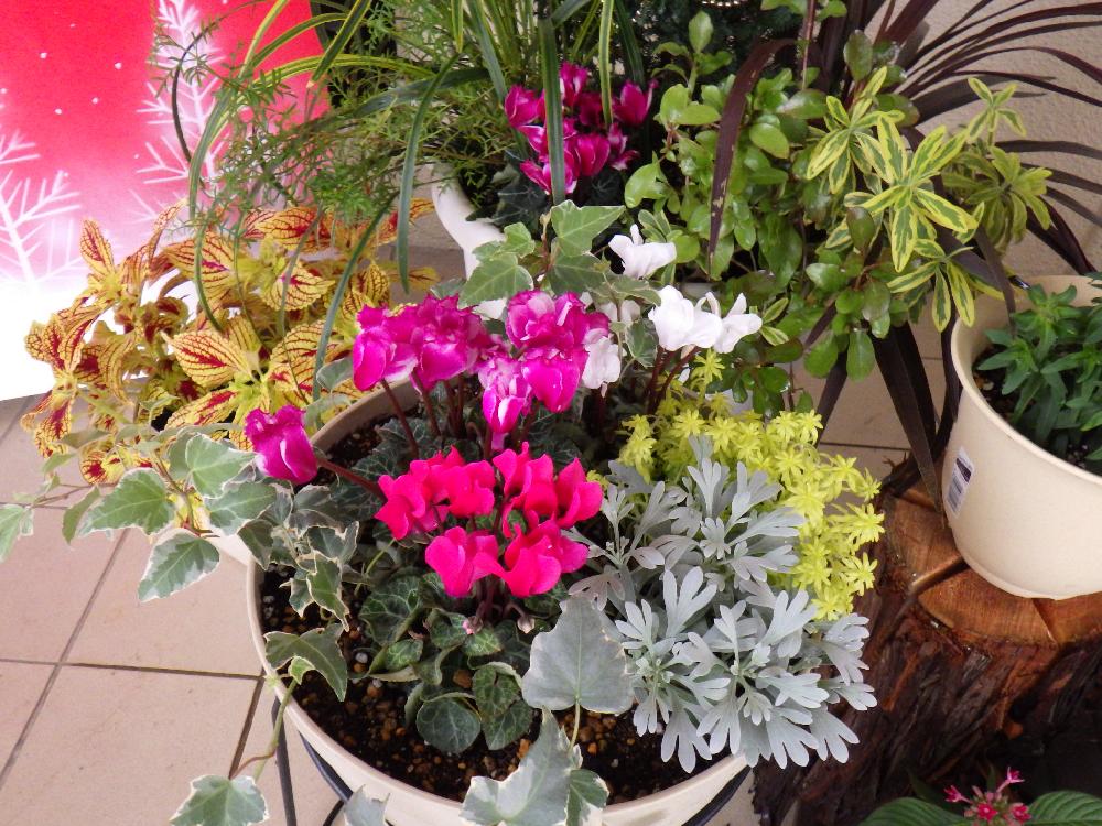 針葉樹をメインに赤やピンク、白色の花を選び、シルバーリーフを組み合わせてクリスマスらしい寄せ植えができました(*’▽’) |
