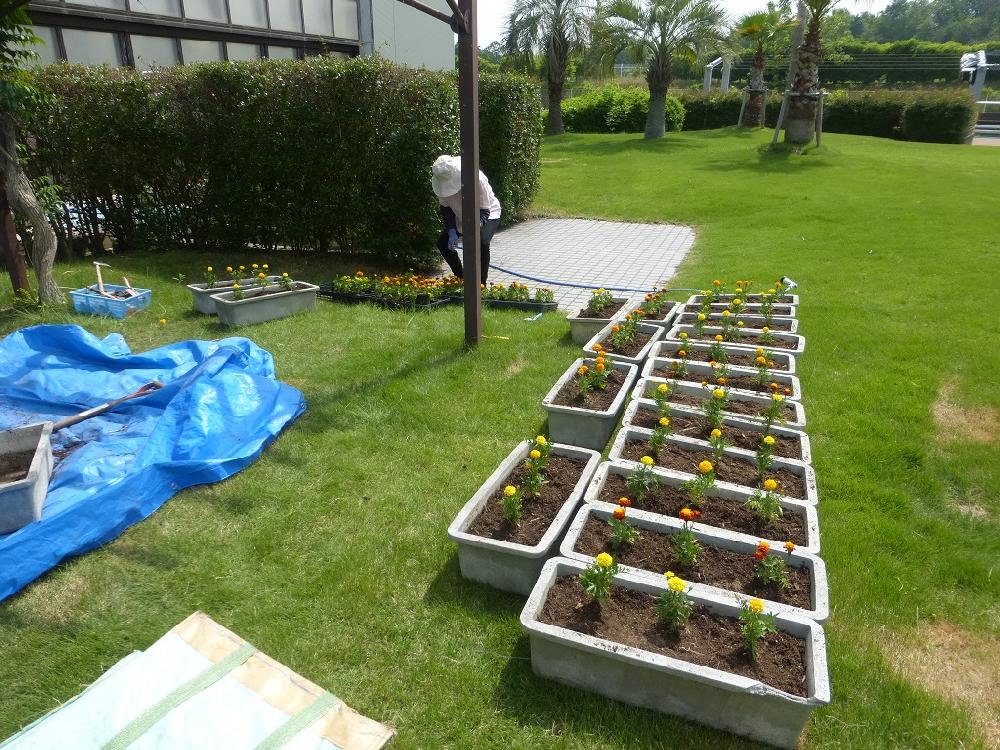公園事務所の前にマリーゴールドのプランターを並べました。